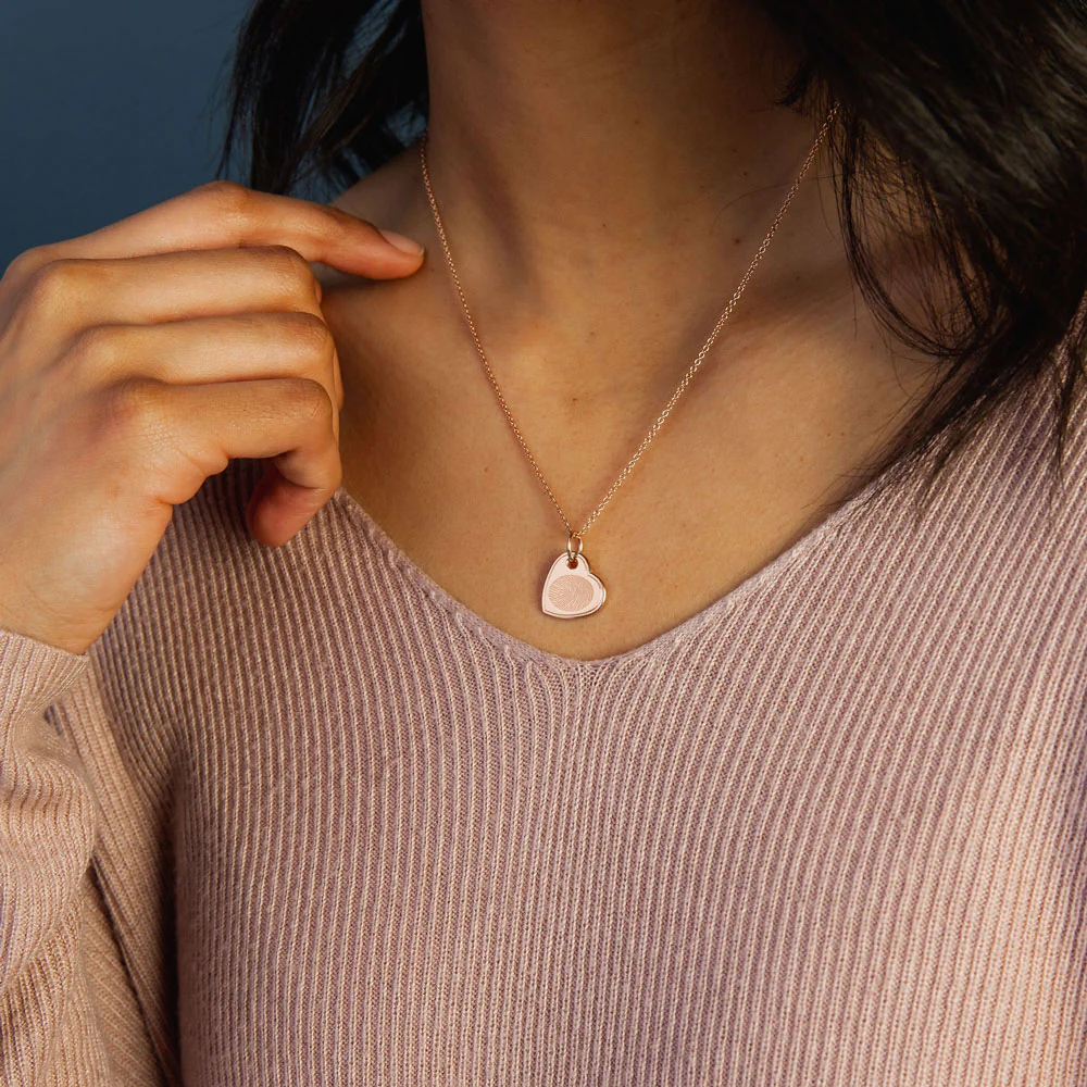 Feel your Loved Oneās touch forever near with a Fingerprint Charm in gleaming 14k Rose Gold. Each personalized Offset Heart Charm is handmade to be one-of-a-kind and features a raised, rounded edge, and the fingerprint pattern nestled in a debossed oval to suggest a light, tangible touch. Smaller and lighter than Pendants, our Charms can be worn on Necklaces. Our custom Offset Heart Charm is a beautiful Jewelry piece that can be given as a gift to connect families, or kept as a memorial Keepsake that honors a unique life while providing unsurpassed peace.