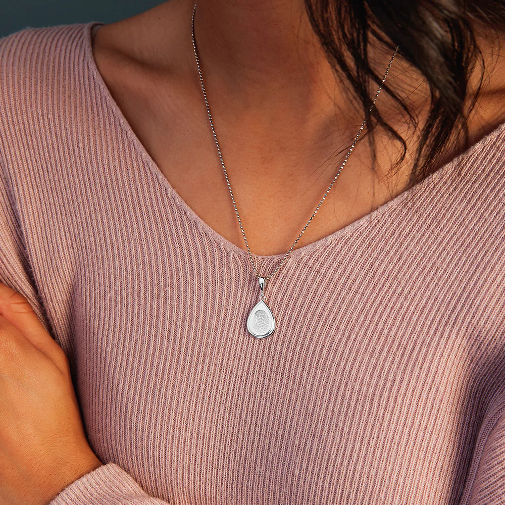 Our Fingerprint Charm in lustrous Sterling Silver allows you to wear the touch of someone you love near each day. Smaller and lighter than Pendants, our custom Charms can be worn on Bracelets, Necklaces, and more. Each unique Tear Drop Charm is handmade by local artisans to have a raised, rounded edge, and the engraved fingerprint patterned nestled in a debossed oval to suggest the light presence of a fingertip’s touch. These details create a beautiful Jewelry piece that provides immense comfort and connection. Charms can be given as a meaningful gift, or kept as a heartfelt memorial Keepsake.